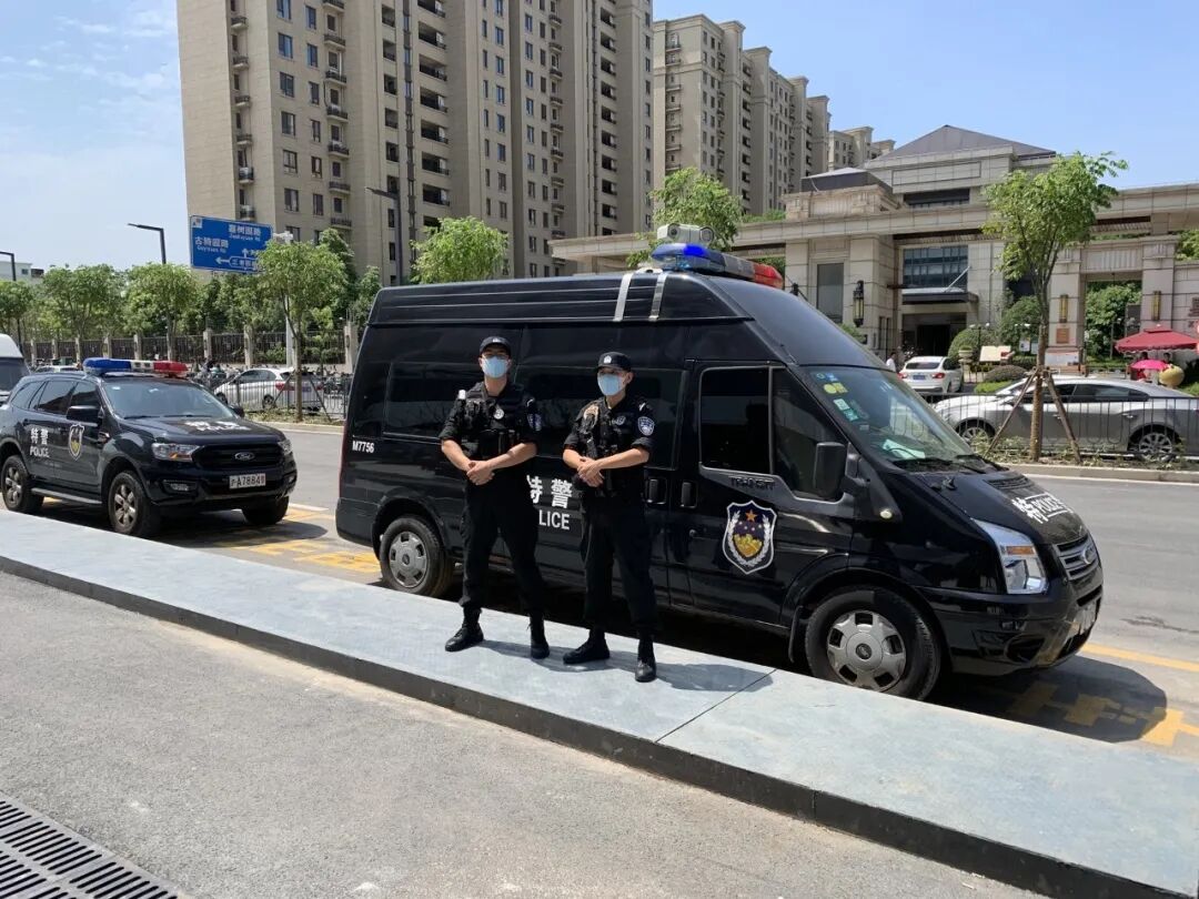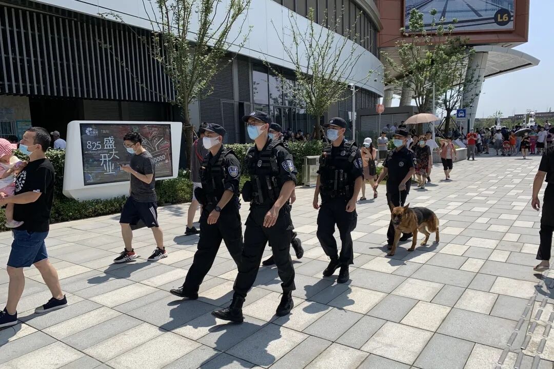 ▲ 特警在印象城周边步巡维护现场治安秩序,并开展定点值守工作。