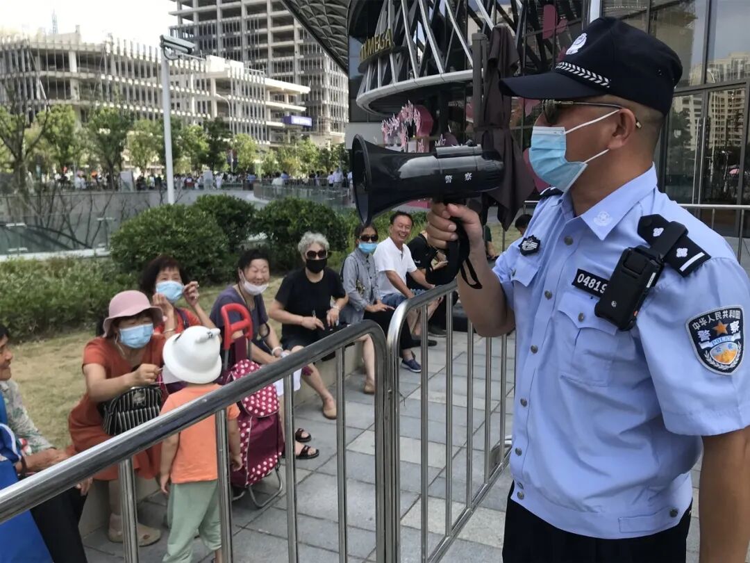 ▲ 民警在商场门口提醒等候游客提前准备口罩,进场时需测温,注意有序排队入场。