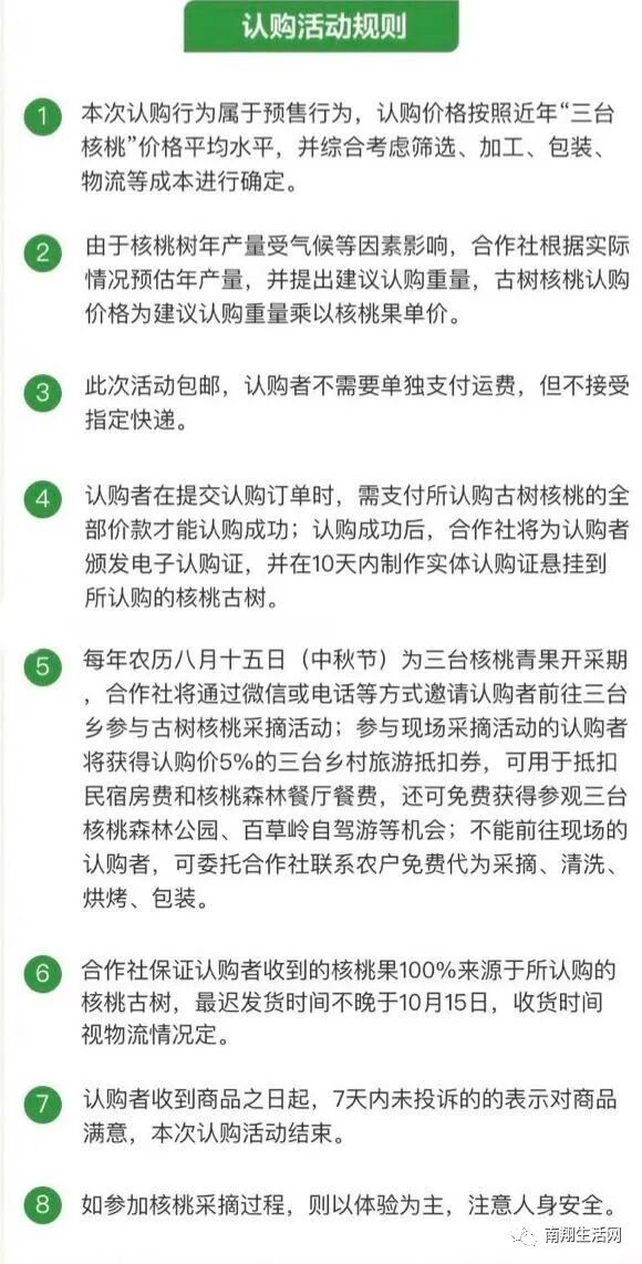 5、每年农历八月十五日(中秋节)为三台核桃青果开采期合作社将通过微信或电话等方式邀请认购者前往三台乡参与古树核桃采摘活动;参与现场采摘活动的认购者将获得认购价5%的三台乡村旅游抵扣券,可用于抵扣民宿房费和核桃森林餐厅餐费,还可免费获得参观三台核桃森林公园、百草岭自驾游等机会;不能前往现场的认购者,可委托合作社联系农户免费代为采摘、清洗、烘烤、包装。