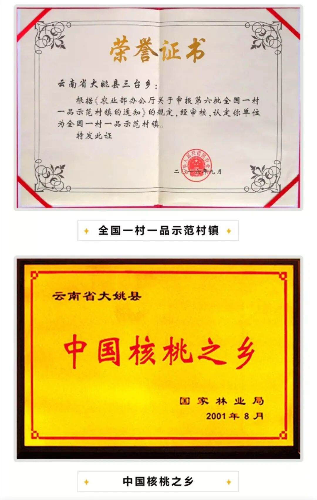 大姚县“三台核桃”2000年通过欧盟有机食品认证、2013年被国家林业局认定为“国家级核桃示范基地”、2016和2019两度荣获国家农业农村部命名表彰的“全国一乡一品(核桃)示范乡镇”称号,以及由“三台核桃”品系培育壮大的“大姚核桃”品牌先后获得“国家地理标志证明商标”“中国驰名商标”和”国家地理标志保护产品“等荣誉。