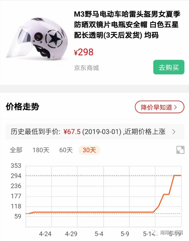 目前,淘宝、京东等电商平台上,多数头盔的价位在100到200元之间。普通的“哈雷”型半盔,平时售价为85元,5月16日涨到188元,5月19日又涨到了298元。不少网友表示:还没反应过来,头盔的价格已经猛涨。