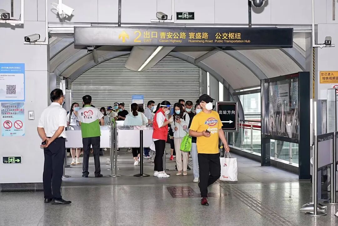 在昆山花桥的兆丰路站,按照防疫要求,乘客进站要扫“场所码”,须出示72小时内核酸检测阴性证明或24小时内核酸采样证明,且体温正常(<37.3℃)进站。