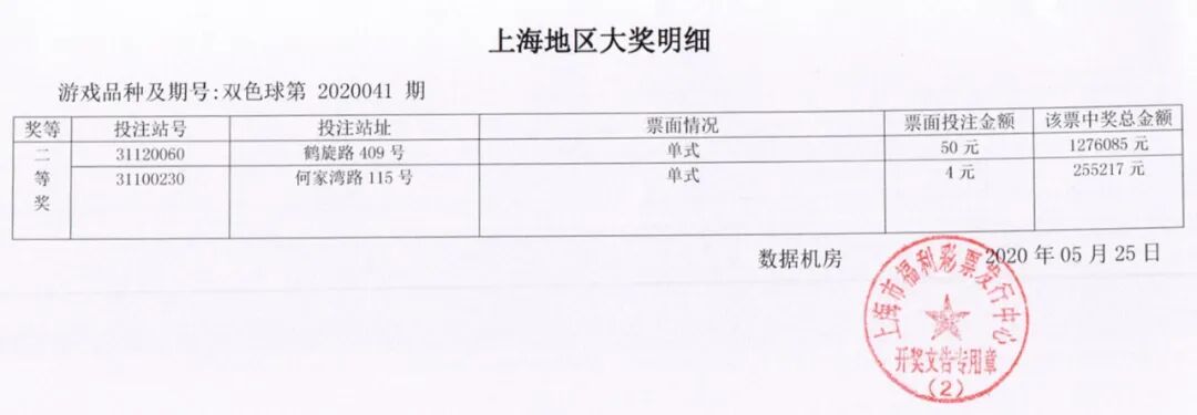 数据显示,嘉定鹤旋路中得6注二等奖,单注奖金255217元,彩票分别售出于鹤旋路409号、何家湾路115号福彩销售点,其中售出于嘉定鹤旋路409号彩票独揽5注二等奖,中得奖金1276085元。