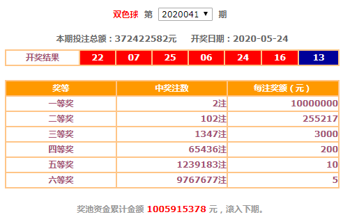 5月24日晚,中国福利彩票双色球游戏进行第2020041期开奖。当期双色球红球号码为06,07,16,22,24,25,蓝球号码为13。