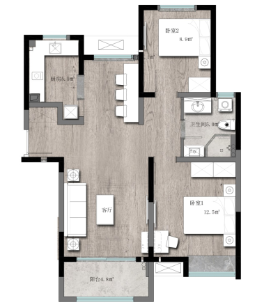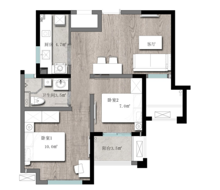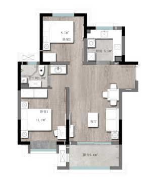 二居室(68.56~84.9㎡/套) 月租金区间:2700~3600元