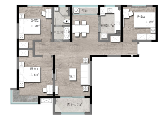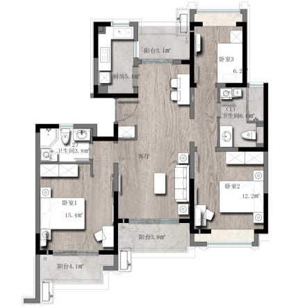 三居室(121.8㎡/套) 月租金区间:4400~4800元