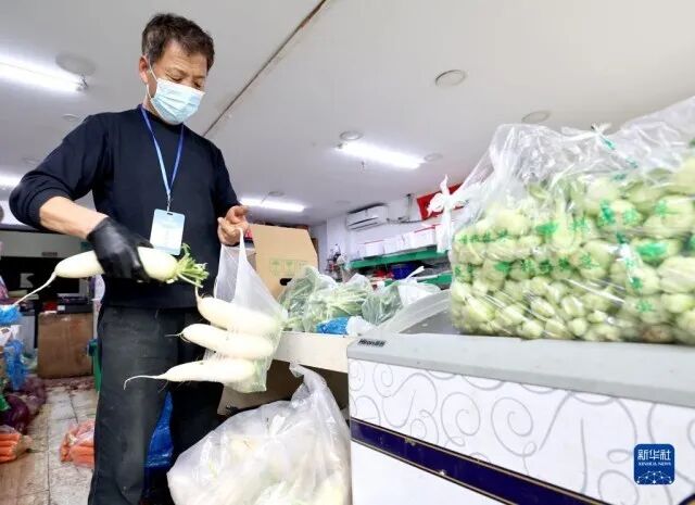 4月10日,上海超杰综合生鲜超市员工徐启银在恢复营业的店内为网上订单分装蔬菜