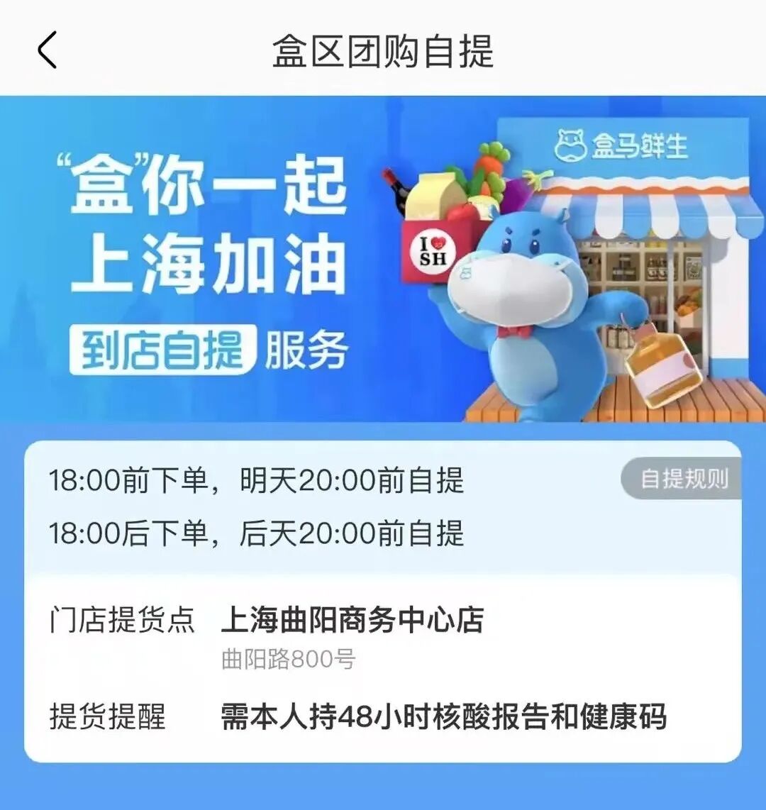 另外,记者从盒马了解到,截至目前,上海20多家正在营业中的盒马鲜生店已全部开通“团购自提”服务。有自提能力的团体、单位或个人可选择就近门店,提前一天预约,次日到店自提。
