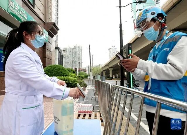 4月10日,上海国大药房南京西路店员工梁婷婷(左)在店前向快递小哥交送顾客的订单。