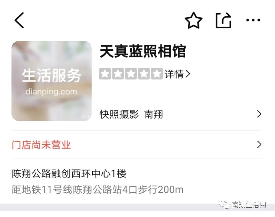 小编也在大众点评上搜索了下,发现嘉定区的天真蓝照相馆(南翔门店)显示尚未营业。