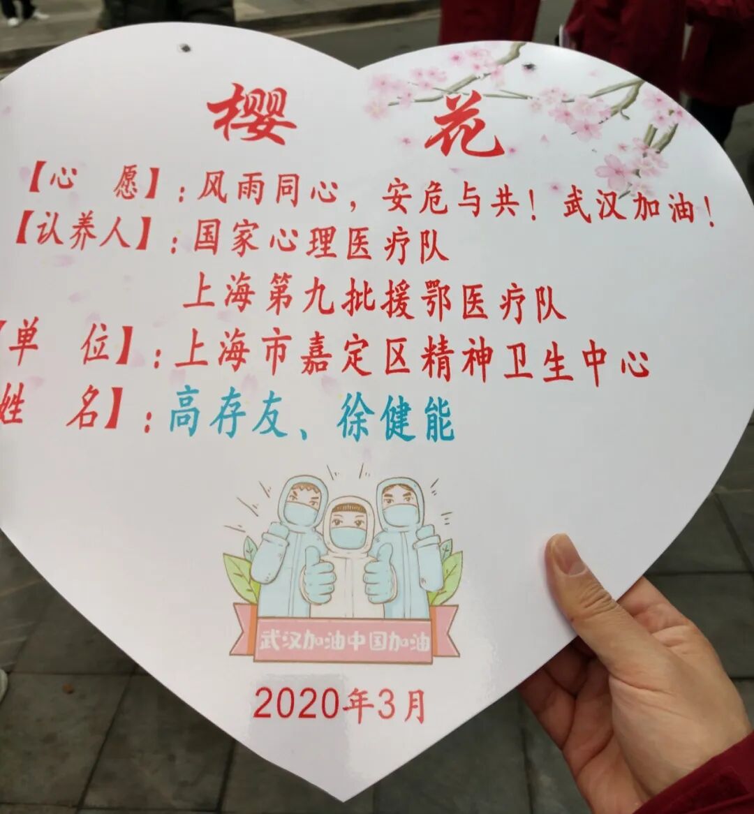 前天下午,上海心理医疗队在武汉西北湖边上认养了17棵樱花树,其中嘉定第二批援鄂医疗队共认领了两棵,他们在樱花树下拍了集体照,并写下:“英雄武汉,一定嘉奖。”