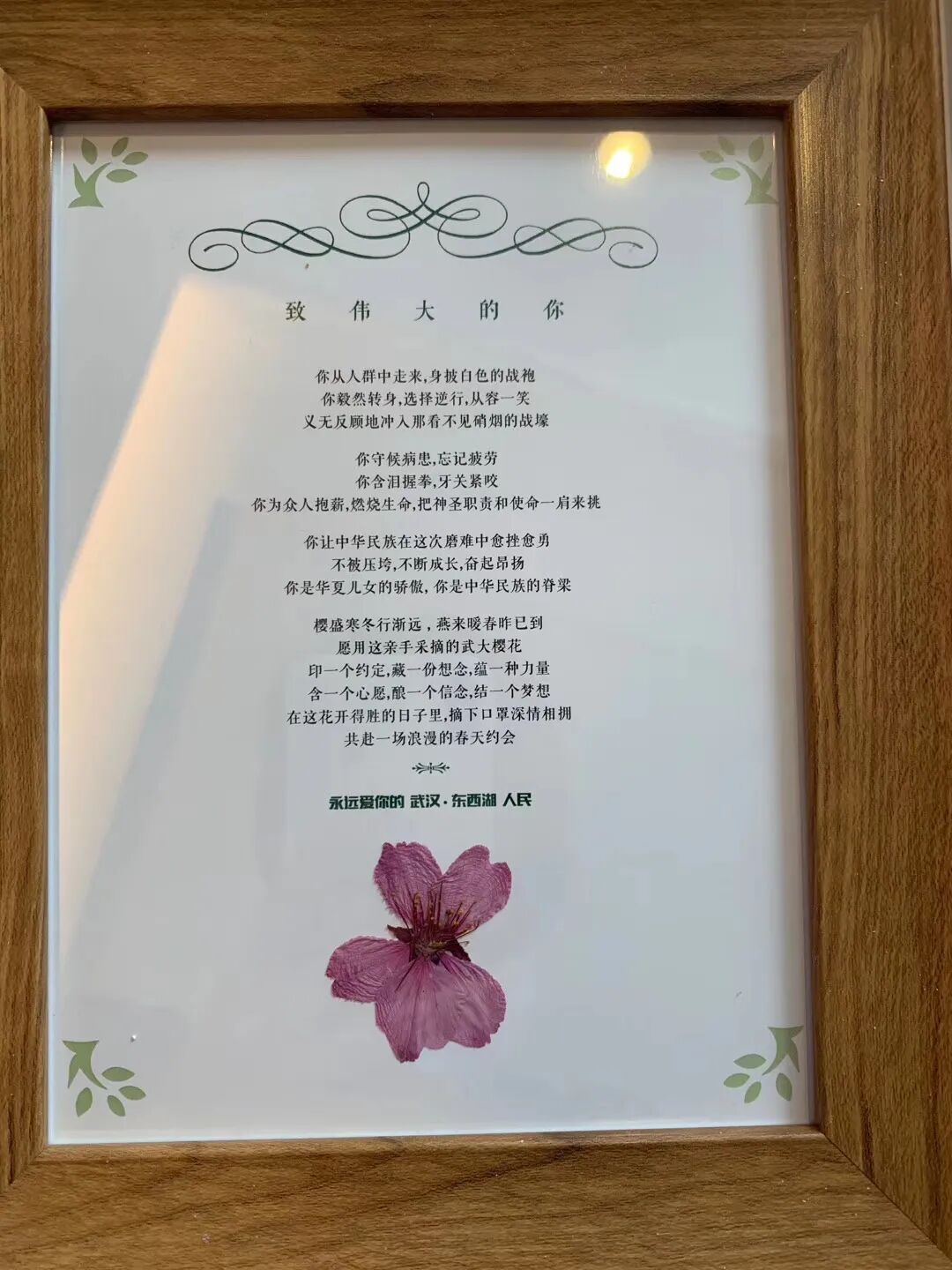 而这张来自武汉市东、西湖区颁发的纪念证书,上面有一朵武汉市民亲手采撷的武大樱花。“约定在这花开得胜的日子里,你我摘下口罩深情拥抱。”寥寥数语,情真意切。