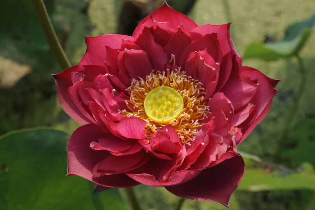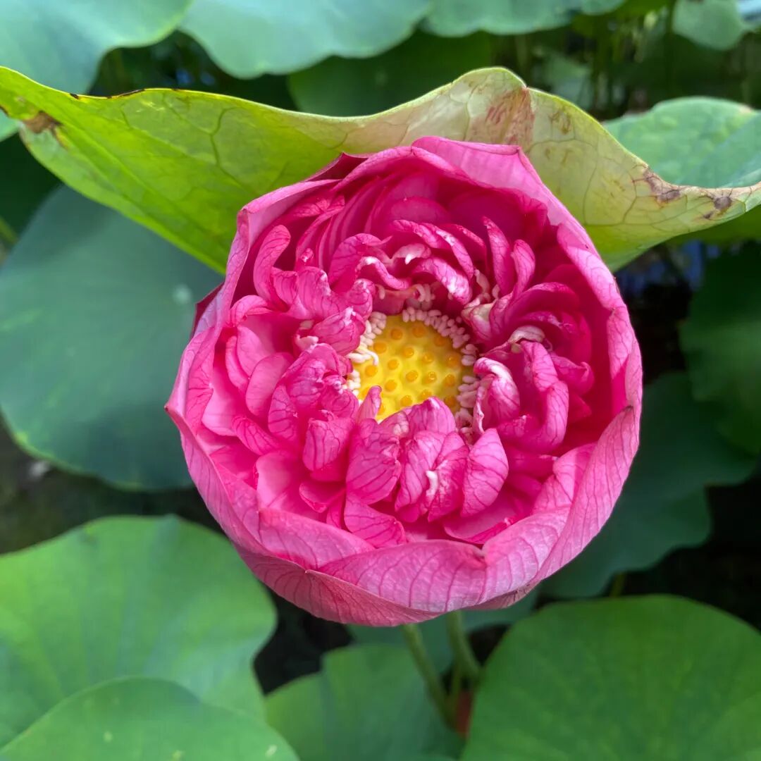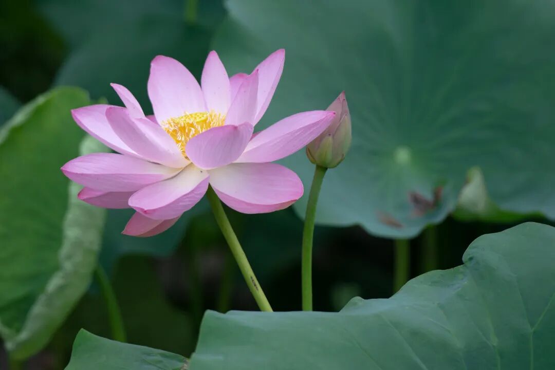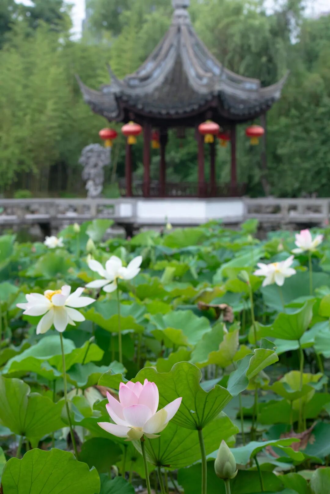 君到猗园见,水港小桥多。园内湖池遍布,植有多个品系荷花,亭台楼桥与荷花相映成趣,赏荷意境更显高雅。池中多为大株型荷花,高大健壮,气势磅礴,且群体花期长,叶大花大,因此观赏期也较长。
