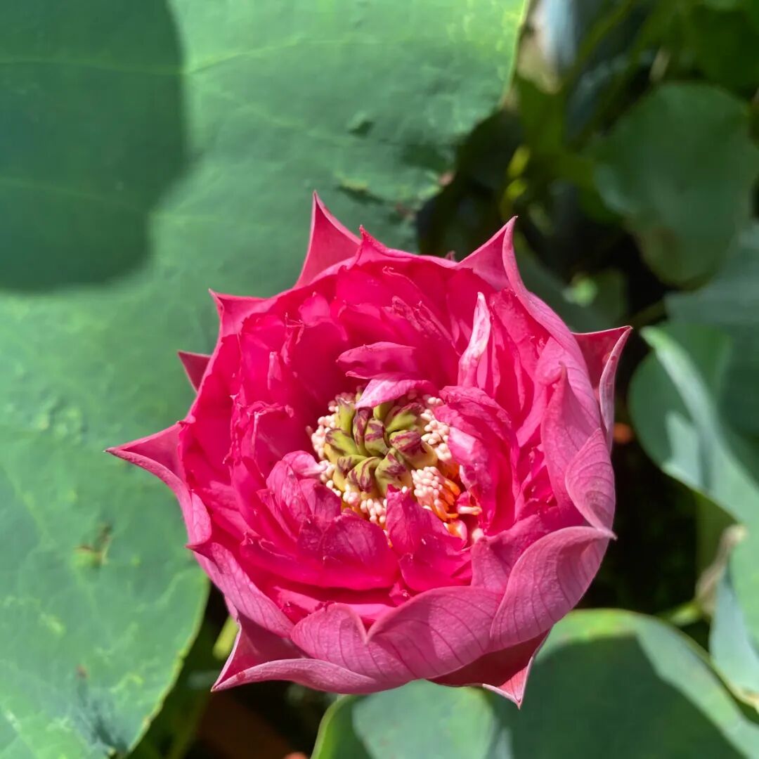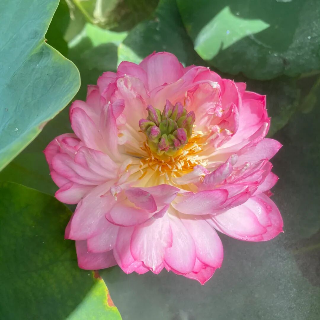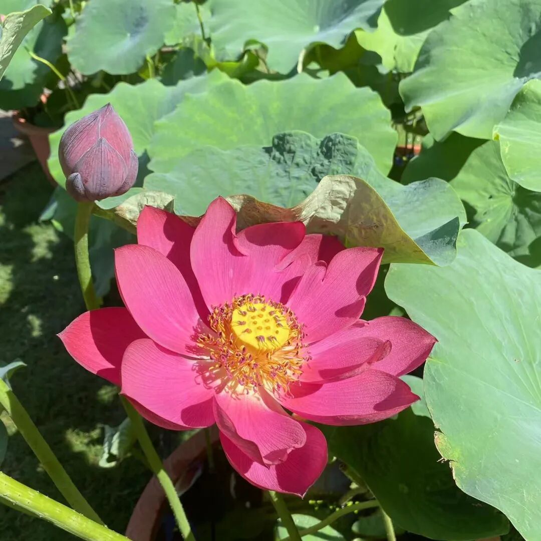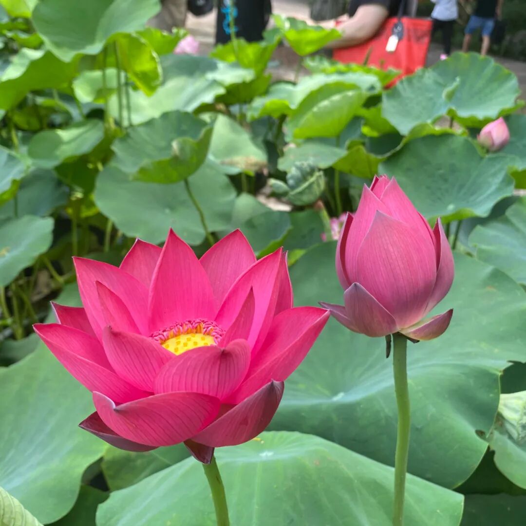 莲叶田田盖,荷花别样美。大草坪约600㎡区域内布置了600余盆荷花品种,组成“500”的字样,寓意建园500周年,充分展示‘巨无霸’‘国庆红’‘秣陵秋色’等国内外获奖的新优品种。各种类型的红色系、白色系、黄色系、粉色系以及复色系荷花品种簇拥在碧绿的草坪上,游客可以近距离观赏不同花色、不同瓣型、不同姿态的荷花美景。东门平台上展示了‘兰花指橙’‘莲韵牡丹’‘陶令风情’等花型花色罕见的优品荷花,让行至其中的游客收获意外惊喜。展区中,‘红妆江南’‘兰花指橙’‘陶令风情’‘如意莲’‘蜀红莲’等为上海首展品种。盆景园内,于几架和石墩之上展示栽植于不同盆器中小巧精致的碗莲和迷你睡莲,‘大师’‘粉魁’‘莺莺’等复色、粉色、黄色的各种微小荷花、‘紫珍妮’‘海尔芙拉’等迷你睡莲,让游客近距离、全方位领略微小型荷莲的迷人魅力。它们花虽小,却花量大、花期长,娇小可人,备受家庭园艺爱好者的喜爱。