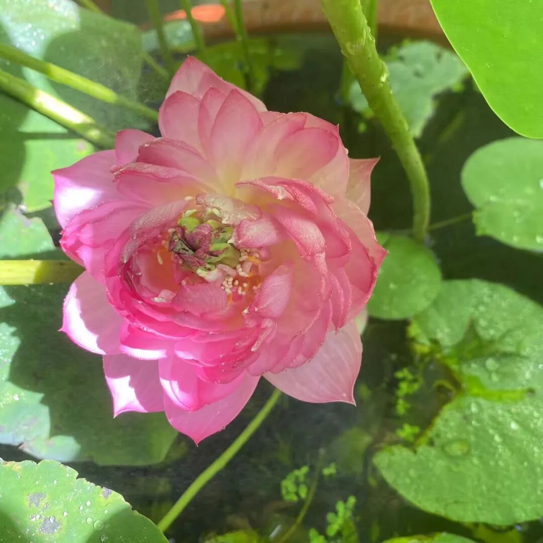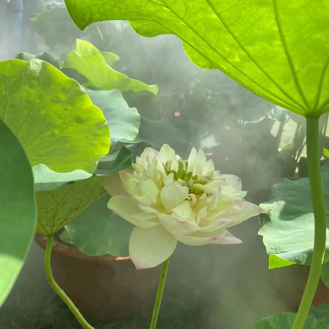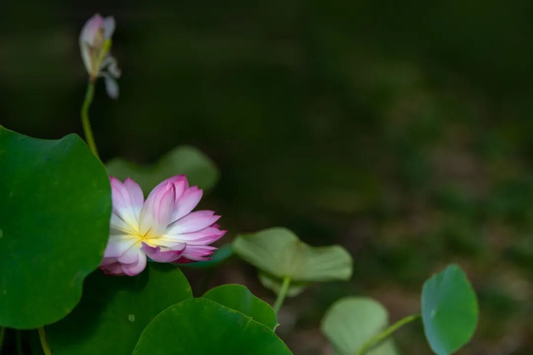 观月台前的混色荷花,白、黄、红、粉,色系齐全;碗、碟、杯、舞,形态万千,每天展现出不一样的色彩,不一样的姿态。戏鹅池里‘太空莲’,荷花围绕着不系舟绽放出红粉色的花朵,今日赏花者可再现昔日园主与文人雅士在舟上赏荷吟诗作对的场景。鸳鸯湖里的‘红建莲’,色彩红艳、株形挺立,无论从九曲桥、柳荫桥,还是茗轩内,各个角度都能欣赏到红建莲的盛景。瘦影碎月轩前那一塘‘西湖红莲’,也是盛开红、粉系荷,花叶更大,背景是假山凉亭、翠竹绿树,行走在曲桥之上,左手边的太空莲和‘红舞裙’组成的一池复色荷花,与右手边纯粹的红色荷花形成鲜明的对比,带来多样的变化,加上喷雾的渲染,宛如走在荷花仙境之中,是不可错过的赏荷打卡点。清磬山房台阶边缘新植了黄色系的‘黄菊莲’‘秣陵秋色’等荷品种,丰富塘栽荷花的色彩,营造薄雾缭绕的赏荷仙境。