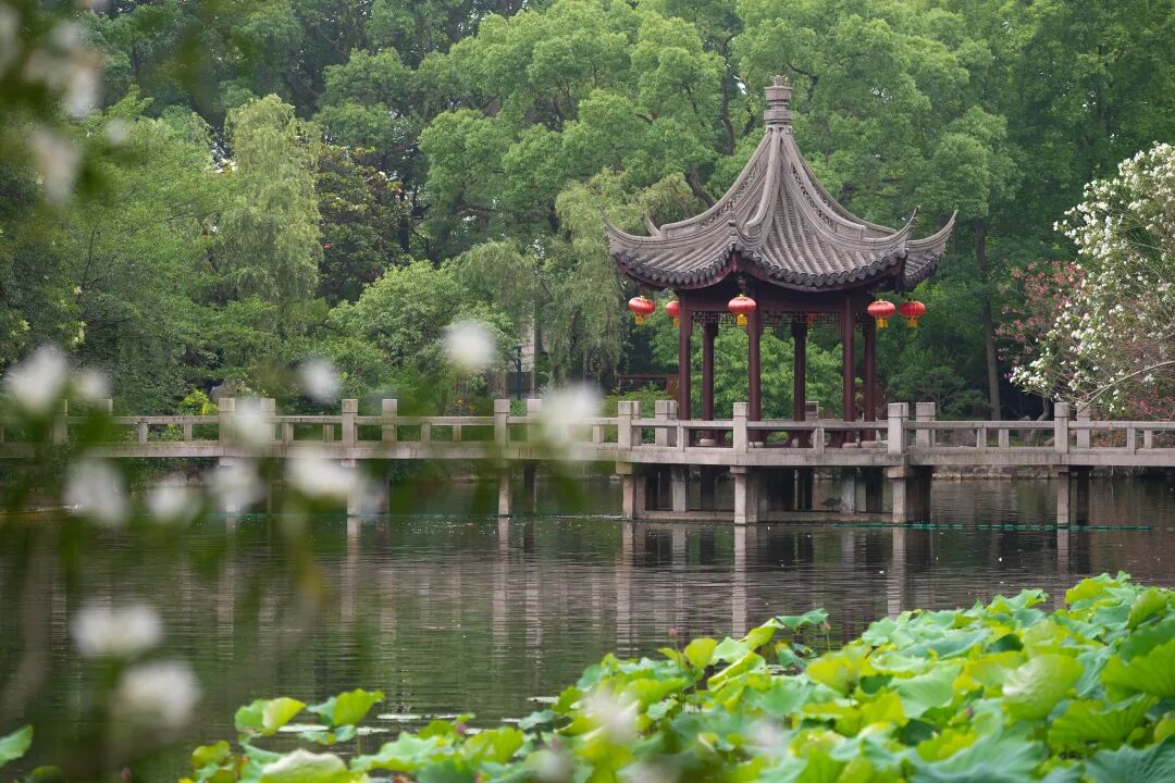 “来往荷香里,竹中惟一凉。”五百年前的园主李宜之就写下了的妙语佳句,仿佛看到戏鹅池畔,园主伴着荷香,在竹林和鸟鸣声中消暑纳凉的场景;清末文人江湄曾应紫鹤之邀,以古猗园内十二景为题作十二绝,其中在《止舫观鱼》(即不系舟)这首诗中写出“菡萏花开香满汀,汀前架屋仿舟形。”的诗句,眼前呈现诗人倚靠不系舟,读书、赏花、观鱼的美妙意境。五百年后的今天,夏日虽炎炎,但清丽荷花与园林景致相互映衬,宛若一幅古色古香的书画,待人品味。无论是“盆中荷”还是“池中荷”,荷花的美与园林的典雅相融合,园内处处皆是“景中荷”,七月起,古猗园的荷莲即将进入最佳观赏期。