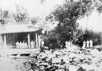 据记载,先秦时江南便已出现,吴王夫差在“馆娃宫”中挖建玩花池,池内广种荷花,水畔筑亭廊便于饮茶观赏。“池赏”是最为普遍的赏荷方式。早在1915年夏,海上题襟馆金石书画会吴昌硕、汪洵等12位会员来到古猗园赏荷,并拍照留念。而今这一池荷花又原原本本的出现在戏鹅池中。
