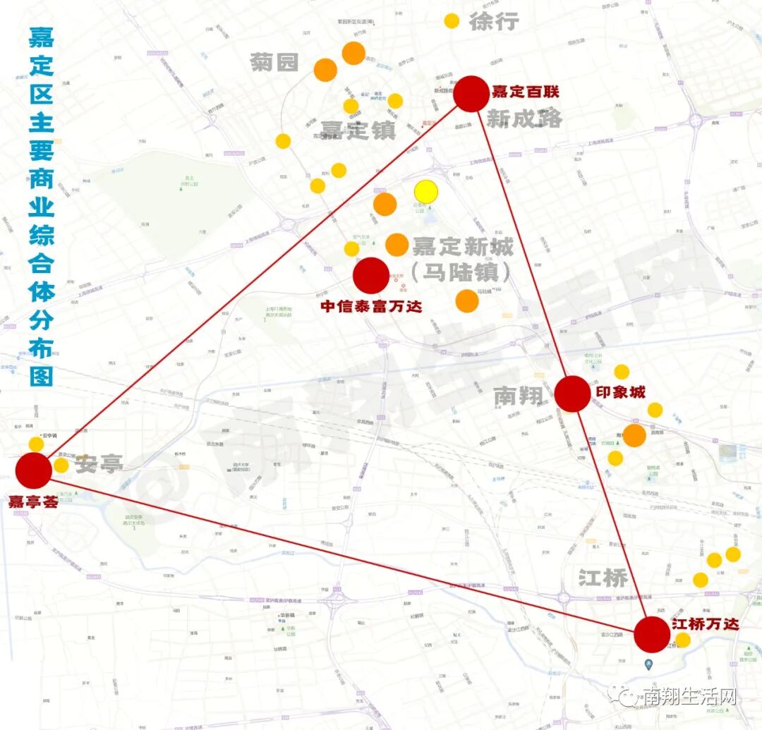 蛋哥将嘉定主要商业体进行的标注,发现一个很有意思的现象。其中最大的四家商业体——南翔印象城、江桥万达、安亭嘉亭荟、新成路的嘉定百联、新城核心区的中信泰富万达合围成了一个几乎标准的等边三角形,嘉定绝大部分商业体都围绕在这几个航母商业体旁。
