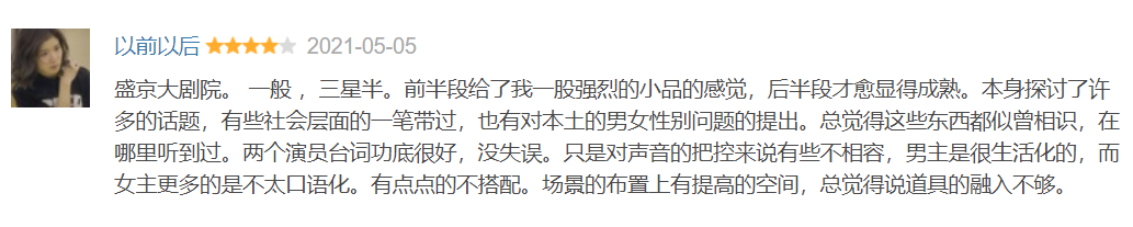 戏剧不一定是大开大阖,冲突激烈,它是生活的一部分,娓娓道来,甘之如饴。林兆华导演在制作这部话剧的时候,就提出一个理念: 要让戏剧回归到最本真的样子。