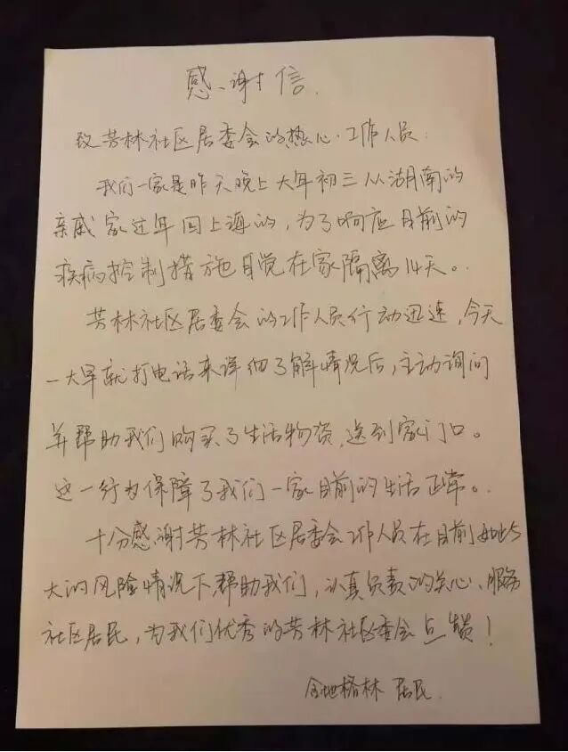 南翔镇执委为隔离家庭买菜送菜、芳林社区妇女干部为居家隔离观察居民代买生活必需品,一封沉甸甸的感谢信是对她们最好的回馈……一件件平凡而温暖的小事感动着身边的每一个人。