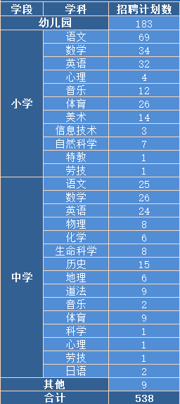 根据上海市人力资源和社会保障局《关于印发<上海市事业单位公开招聘人员暂行办法>的通知》(沪人社专〔2009〕45号)文件要求,为加强师资力量,建设一支高素质、专业化的师资队伍,我区教育系统将面向社会公开招聘教师。2021学年第一批计划招聘教师538名。