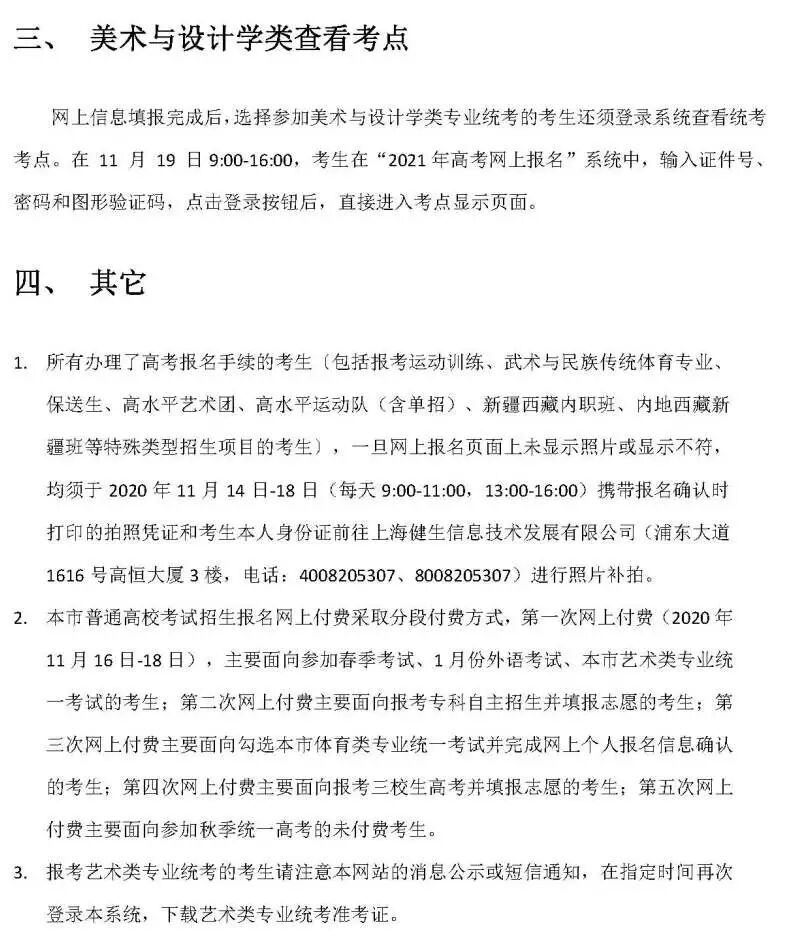 本市普通高校艺体类专业统一考试采取系统统一分配考点的方式。报名参加美术与设计学类专业统考并完成网上付费的考生须于2020年11月19日9:00-16:00登录“上海招考热线”网站,查看系统分配考点情况。