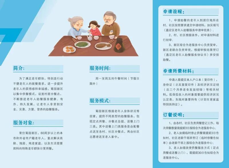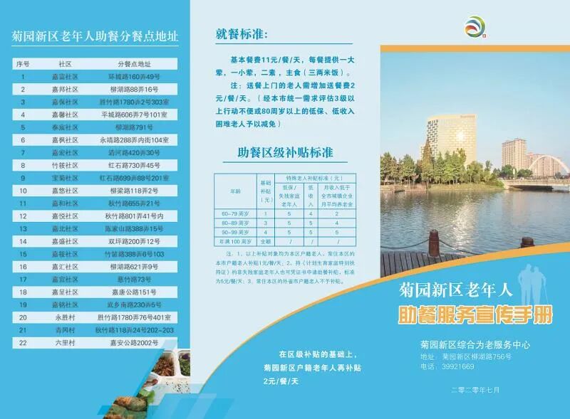 近年来,为了满足老年群体特别是行动不便老人的就餐需求,菊园新区以集中供餐的模式,为有需要的老人提供周一至周五的午餐配送服务,并设置村居分餐点,不断推进老年人助餐服务健康、有序、持久发展,让老年人享受到安全、实惠、方便、营养的助餐服务。