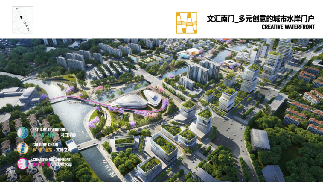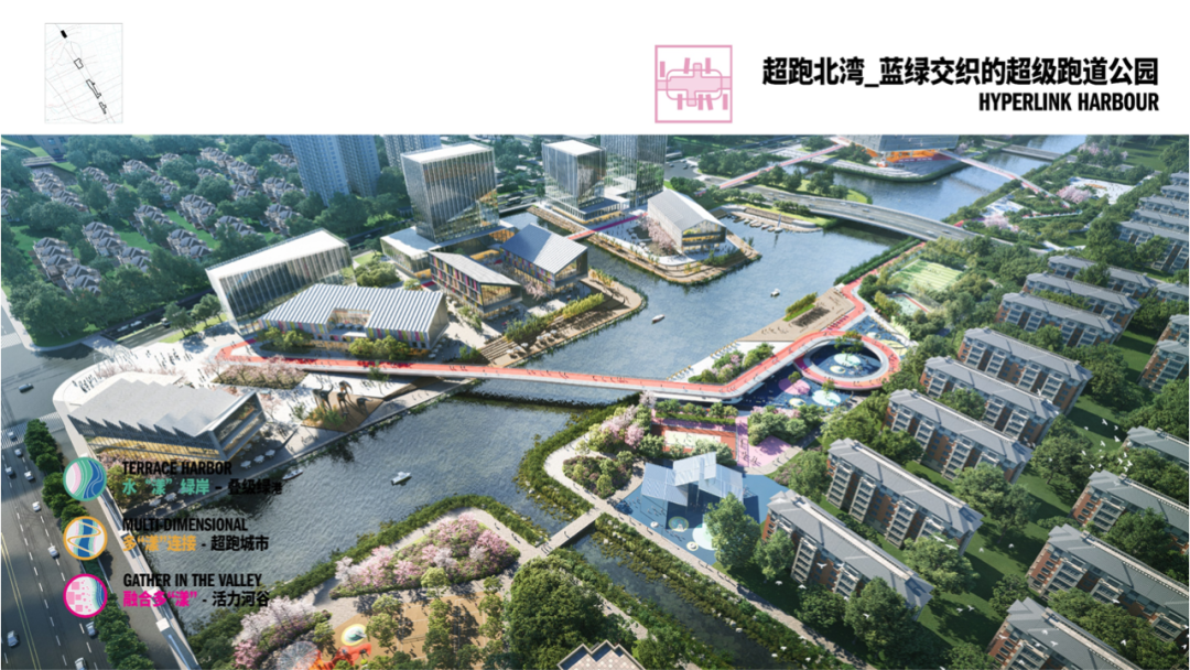设计方案中,“超跑北湾”将打造蓝绿交织的超级跑道公园,设计打破单一水岸线,植入智慧服务类科创企业,1.5公里环形跑道串联场地,将成为未来的嘉定城北门户;“文汇南门”打造创意多元的城市水岸门户和具有浓郁文化气息的滨水休闲场所,将打通城市廊道带动周边地块发展,成为新老城区的核心枢纽;“远香水街”将与上海保利大剧院等大型地标性建筑互补,将城市功能渗入公园,同时将水岸生活引入城市;“绿洲学堂”将打造自然有机的生态教育水岸,更新利用现存建筑,以低影响开发为理念,以户外课堂、教育中心展现自然和谐的生活方式。