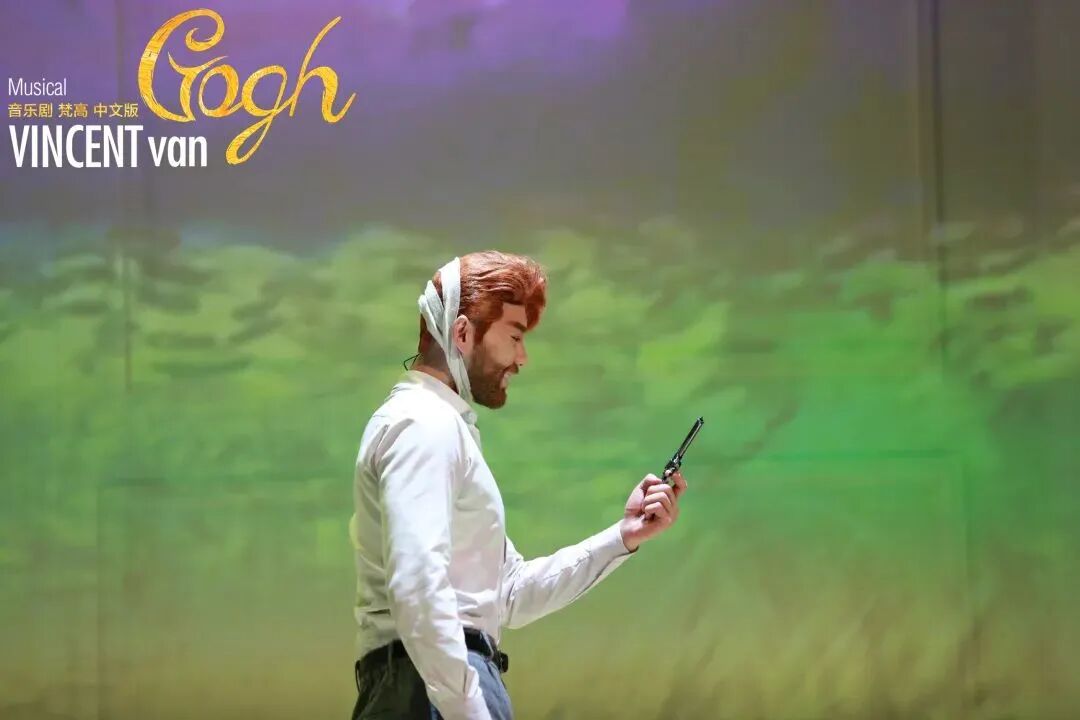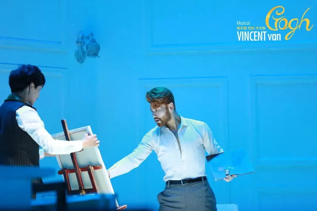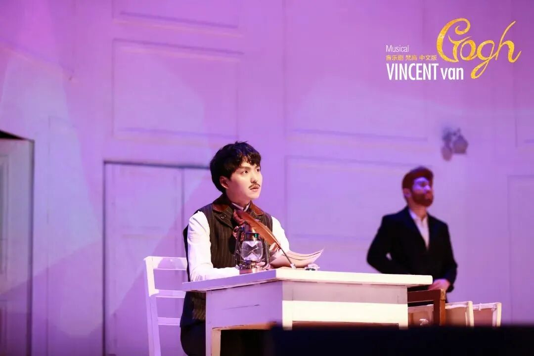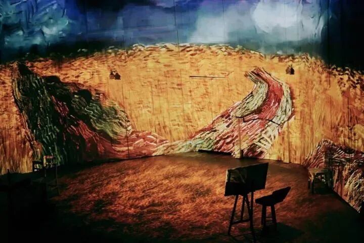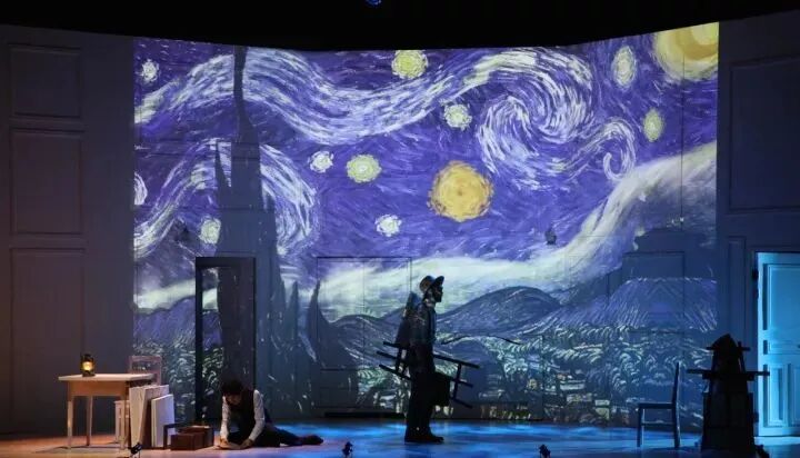 不同于普通舞台剧的背景布置,音乐剧《梵高》的背景舞台被设计成180度的环形房间,犹如一个180度的环形幕布,整个舞台仿佛如同大师的一整幅油画。画如其人,舞台即梵高的画布。