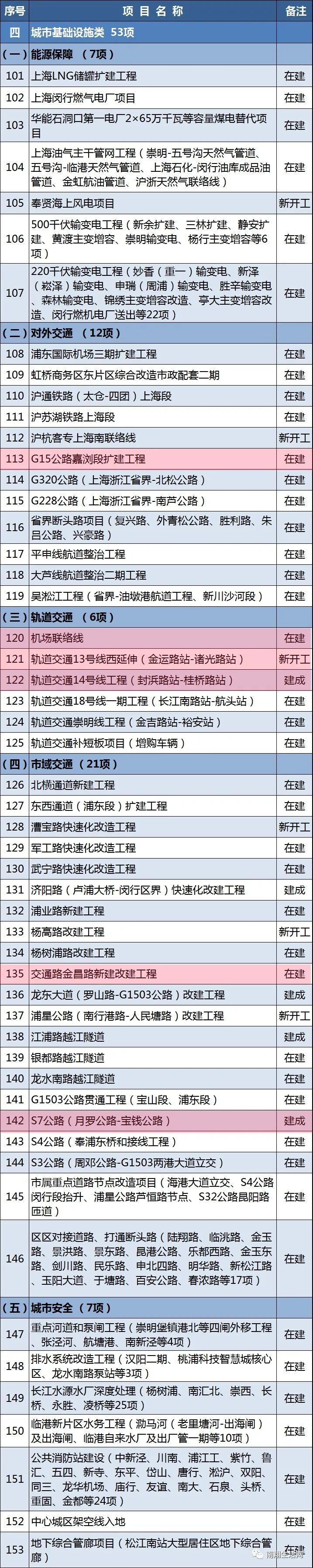 计划新开工6项:奉贤海上风电项目、沪杭客专上海南联络线、轨道交通13号线西延伸(金运路站-诸光路站)、漕宝路快速化改造工程、杨高路改建工程、浦星公路(南行港路-人民塘路)改建工程。
