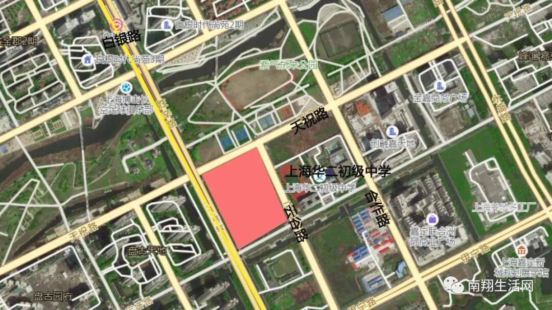 嘉定区嘉定新城,基地东侧为云谷路,南侧为宝塔路,西侧为胜辛路,北侧为天祝路
