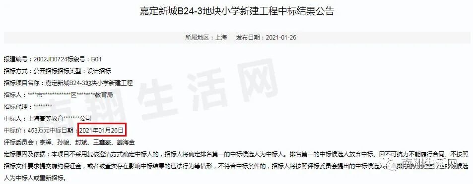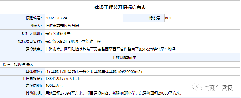据悉,去年12月25日,该项目启动建设招标通过招标信息,南翔生活网获悉,B24-3地块小学工程总投资18841.93万元,建设周期400历天,招标人为上海市嘉定教育局。     南翔生活网从招标网信息:招标工作已于今年1月26日完成。