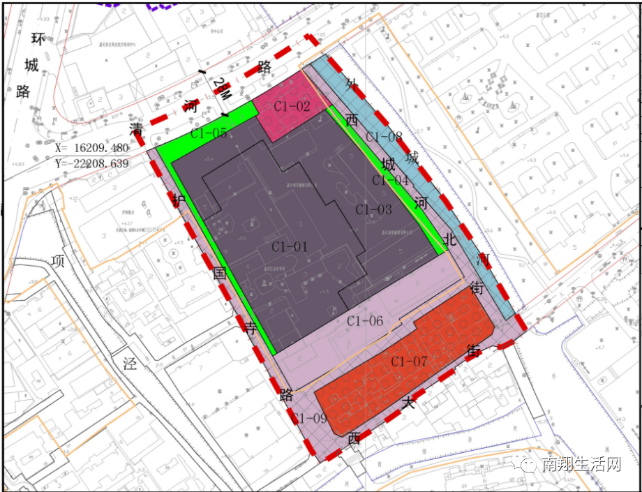 本次涉及调整的C1街坊位于西门历史文化风貌保护区东侧,四至边界:北至清河路、西至护国寺路、南至西大街、东至外城河,用地面积约 2.79 公顷。