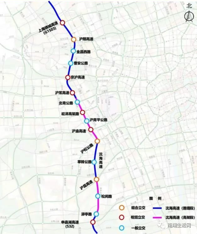 沈海高速(G1503-S32)沿线规划设置7处一般立交(金昌西路、曹安公路、北青公路、沪青平公路、莘砖公路、松闵路、泖亭路),其中金昌西路立交、松闵路立交为规划新增。