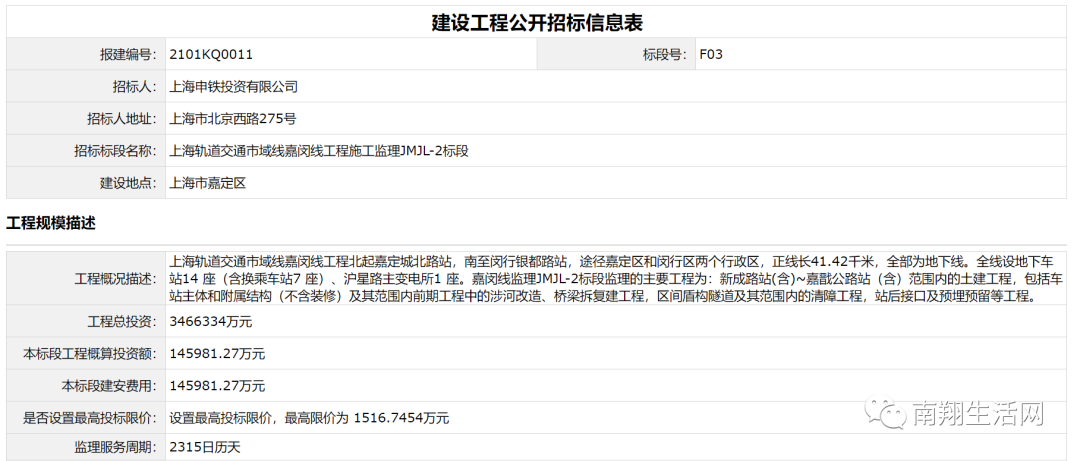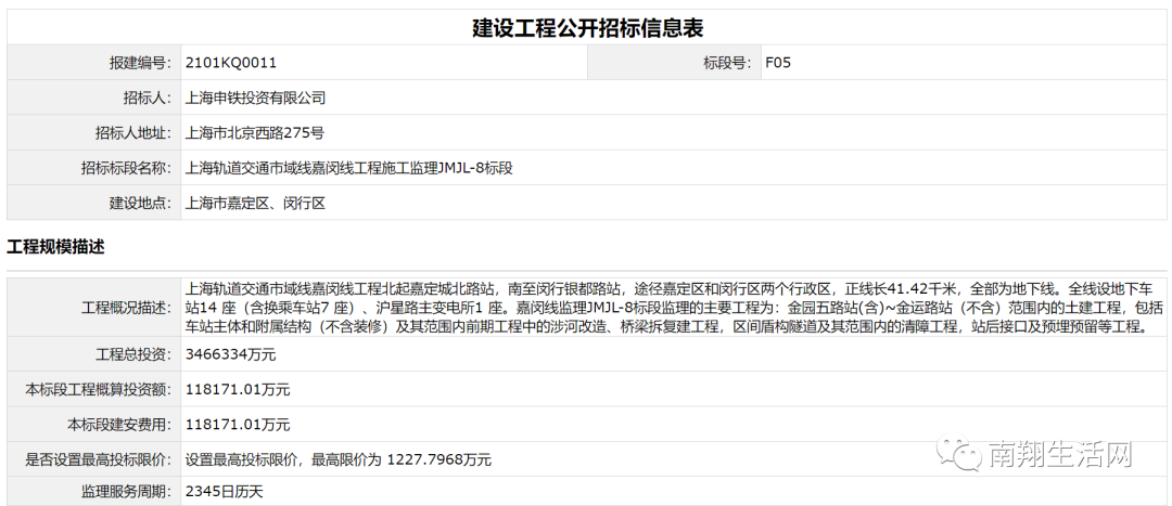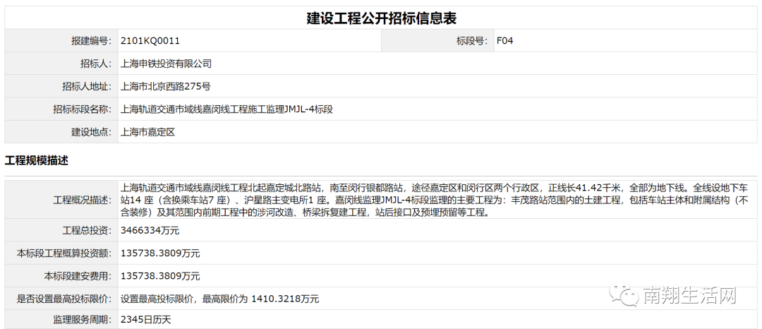 招标人: 上海申铁投资有限公司    招标标段名称:上海轨道交通市域线嘉闵线工程施工监理JMJL-4标段    建设地点:上海市嘉定区