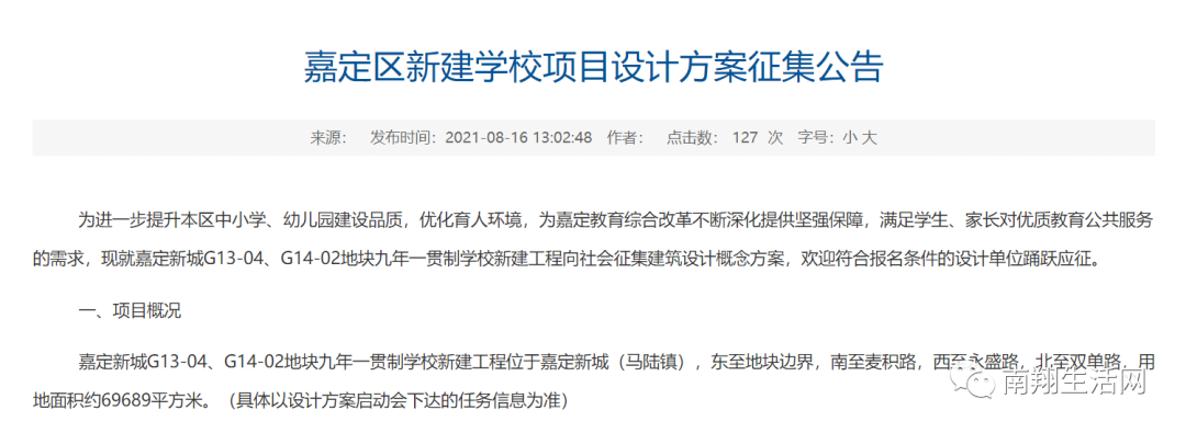 今日,小编在嘉定教育局官网看到,嘉定区将新建一所学校,项目设计方案征集公告已出。嘉定将再多一所九年一贯制学校!