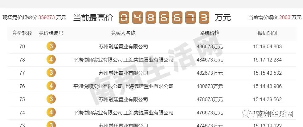 79轮激烈竞拍,融信进驻南翔 南翔生活网刚刚通过现场直播收看了本次拍卖,可以说竞争非常之激烈。今日参加竞拍的有4家单位,分别是上海友登实业有限公司(保利集团)、苏州融廷置业有限公司(融信集团)、深圳市卓越商业管理有限公司(卓越集团)、平湖悦顺实业有限公司(新城控股)&上海隽捷置业有限公司(路劲)的联合体     在拍卖的前半段,竞争主要集中在卓越与新城&路劲联合体之间,而新城&路劲联合体感觉势在必得,每次超价后,几乎是秒加。   当总价进入40亿元以上后,融信开始发力,最终经过90分钟,融信最终获得了南翔的黄金地块。