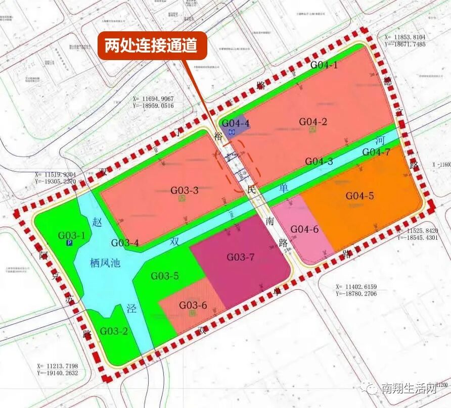 2)连通道:规划于G03一3及G04-2地块间跨裕南路设置两处地上连通道;