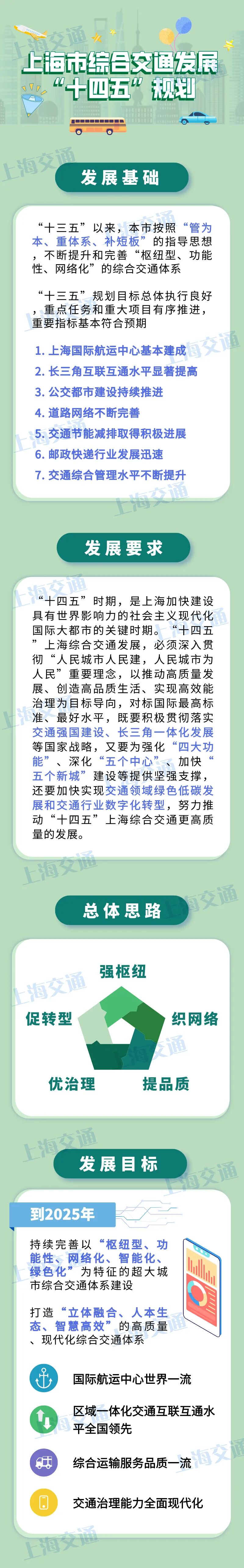 1、“十三五”时期的综合交通大发展为“十四五”奠定了坚实基础。过去五年,按照“管为本、重体系、补短板”的指导思想,不断提升和完善“枢纽型、功能性、网络化”的综合交通体系,“十三五”规划目标总体执行良好,重点任务和重大项目有序推进,重要指标基本符合预期。突出表现在: 一是上海国际航运中心基本建成。2020年,上海港集装箱吞吐量达到4350万标准箱,连续11年位居世界首位。2020年航空受疫情影响较大,但2019年上海航空客货吞吐量达到1.22亿人次、406万吨,分别位列全球城市第4位、第3位。 二是长三角互联互通水平显著提高。沪苏通铁路建成通车,一批铁路、国省干道加快新建改建,一批省界断头路实现联通。 三是公交都市建设持续推进。2020年轨道交通运营线路总长达到729公里。公交专用道通行效率有效提升,开通运营延安路中运量71路。 四是道路网络不断完善。建成S26公路入城段、郊环隧道、虹梅南路高架、北翟路地道等高快速路,以及周家嘴路隧道、长江西路隧道、昆阳路越江大桥等。打通61条区区对接(断头)路。 五是交通节能减排取得积极进展。率先实行船舶排放控制区管控措施,淘汰机场场内高污染车辆1000多台,新能源和清洁能源公交车占全部公交运营车辆的比例提高到67%。 六是邮政快递行业发展迅速。2020年快递业务量完成33.6亿件,约为“十二五”末期的两倍。 七是交通综合管理水平不断提升。道路通行效率总体较好,快速路早晚高峰车速保持平稳。完成了一批与人民生活密切相关的交通实事项目和一批重大活动的交通保障任务。 2、“十四五”时期对上海综合交通发展提出了新的更高要求。“十四五”时期,是上海加快建设具有世界影响力的社会主义现代化国际大都市的关键时期。“十四五”上海综合交通发展,必须深入贯彻“人民城市人民建,人民城市为人民”重要理念,以推动高质量发展、创造高品质生活、实现高效能治理为目标导向,对标国际最高标准、最好水平,既要积极贯彻落实交通强国建设、长三角一体化发展等国家战略,又要为强化“四大功能”、深化“五个中心”、加快“五个新城”建设等提供坚强支撑,还要加快实现交通领域碳达峰、碳中和和交通数字化转型,努力推动“十四五”上海综合交通更高质量的发展。 3、“十四五”时期,上海综合交通发展的总体思路和发展目标。 总体思路是:持续完善以“枢纽型、功能性、网络化、智能化、绿色化”为特征的超大城市综合交通体系建设,坚持“强枢纽、织网络、提品质、优治理、促转型”的发展策略。强枢纽,就是要继续推进枢纽门户功能升级、辐射引领能力增强、资源配置能级提升的航运中心建设。织网络,就是要加快完善综合立体的现代交通网。提品质,就是要满足市民多样化、多层次的出行需要,提供更高品质的交通运输服务。优治理,就是要强化交通设施全生命周期管理,提升精细化治理能力和水平。促转型,就是要大力推进交通领域绿色低碳发展和数字化转型。 发展目标是:打造“立体融合、人本生态、智慧高效”的高质量、现代化综合交通体系,实现国际航运中心世界一流,区域一体化交通互联互通水平全国领先,综合运输服务品质一流,交通治理能力全面现代化。