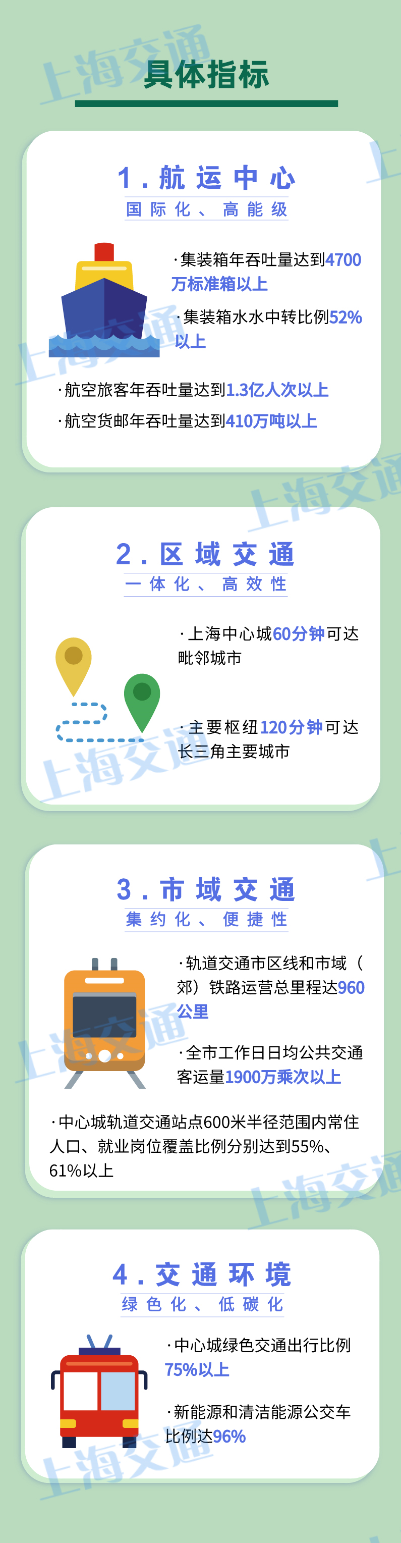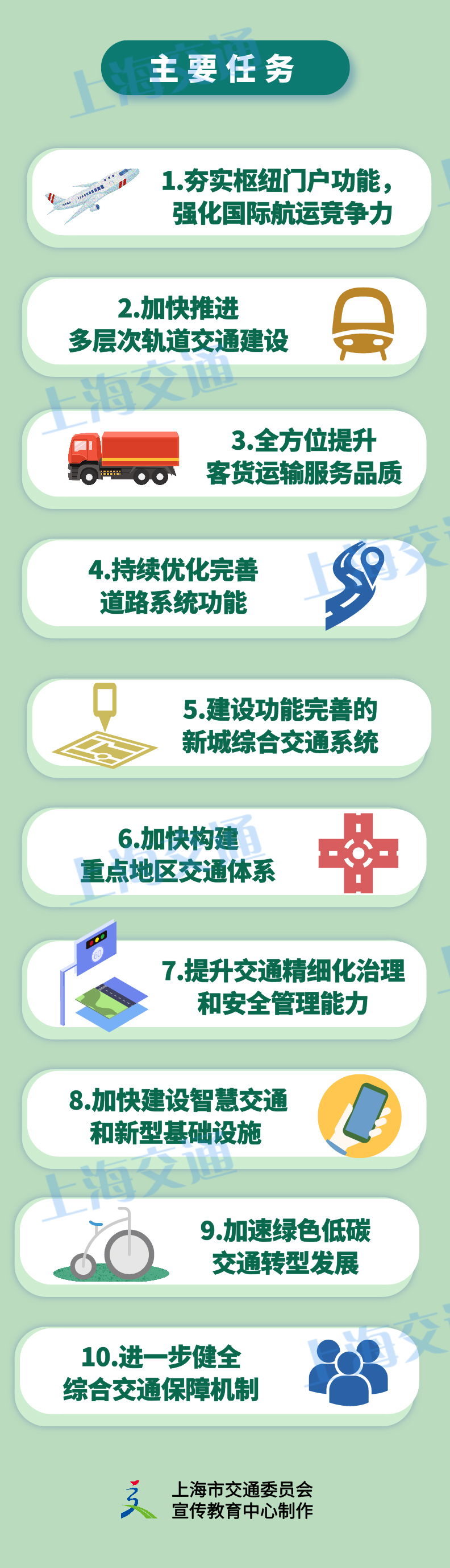 为实现上述目标,《规划》提出了十项主要任务。 第一,巩固和提升国际海空枢纽能级。 海港方面,上海港集装箱年吞吐量达到4700万标准箱(TEU)以上,水水中转比例52%以上,国际航运枢纽港服务品质世界领先,联通、绿色、智能的现代集疏运体系进一步完善。具体举措包括:一要进一步提升港口设施能力;二要打造高效畅达的集疏运体系,特别是要持续推进“一环十射”高等级航道建设,形成“连接苏浙、对接海港”的格局;三要建设国际一流邮轮港;四要健全水上安全保障体系等。 空港方面,航空旅客年吞吐量达到1.3亿人次以上、货邮年吞吐量达到410万吨以上,均保持世界前列,初步形成上海多机场体系,枢纽运量规模、网络品质、中转功能等进一步提升,机场集疏运更加融合高效,服务质量排名保持行业前列。具体举措包括:一要推进浦东国际机场四期扩建,打造世界一流的航空枢纽设施;二要加快建设机场联络线、21号线、两港快线等多层次轨道交通,打造高效便捷的机场集疏运体系;三要建立高效现代的航空快递物流体系,巩固航空货运枢纽地位。 第二,加快完善多层次轨道交通网络。 铁路对外通道方面,加快构建“五向十二线”干线铁路通道布局,实现上海中心城60分钟可达毗邻城市,主要枢纽120分钟可达长三角主要城市。具体举措包括:一要基本建成沪苏湖铁路、沪杭客专上海南联络线,加快建设沪通铁路二期等项目,推进沿江高铁、沪乍杭铁路建设;二要推进嘉闵线北延伸等规划建设;三要完善铁路客运枢纽布局和货运体系。 轨道交通方面,2025年,全市轨道交通市区线和市域(郊)铁路运营总里程达960公里,保持全国前列;中心城轨道交通站点600米半径范围内常住人口、就业岗位覆盖比例分别达到55%、61%以上。具体举措包括:一要推进一批轨道交通项目建设;二要建立站点综合开发机制,实施站城一体化开发模式。 第三,全方位提升客运、货运服务品质。 客运服务方面,继续大力实施公交优先战略,2025年,中心城公共交通出行比重(不含步行)达45%以上,公交专用道高峰时段平均车速保持在16-18公里/小时。具体举措包括:一要进一步增强超大城市公共客运承载能力和服务效能,推进“20+8+X”骨干公交通道建设,完善中运量及多层次的地面公交系统,形成骨干线、区域线、接驳线三级线网;二要注重地面公交与轨道交通的换乘和衔接,加强应急协同和处置能力建设;三要深化出租车行业改革,引导新兴业态健康发展。 货运服务方面,2025年,形成与产业经济发展需求相匹配、与市民生活和商贸物流发展相适应的安全稳定、绿色低碳、经济高效的货运服务体系。具体举措包括:一要推动企业规模化、集约化、品牌化发展,打造健康有序的货运市场;二要强化货运事中事后监管,持续改善货运从业环境;三要优化货运通道组织,积极推进客货分流;四要优化寄递服务体系,扎实推进“快递进村”“快递进厂”“快递出海”等“两进一出”工程。 第四,持续优化完善道路系统功能。2025年,形成高效运行、便捷易达的道路系统,中心城路网密度进一步提高。具体举措包括: 一要进一步完善高快速路网,新建、改建、扩建一批高快速路; 二要进一步完善主次干道和支路网,增加干道规模和贯通性,畅通道路微循环; 三要进一步完善越江跨河通道建设; 四要持续打造“四好农村路”,形成城乡一体、干支衔接、畅通生态的公路网络。 第五,建设功能完善的新城综合交通系统。推进“五个新城”加快形成支撑“30、45、60”出行目标的综合交通体系基本框架:30分钟实现内部及联系周边中心镇出行,45分钟到达近沪城市、中心城和相邻新城,60分钟衔接浦东和虹桥两大门户枢纽。新城道路网密度达到4.5公里/平方公里。具体举措包括: 一方面,要坚持一城一策、站城融合,大力提升铁路、市域铁、轨道交通、骨干道路等对新城的综合服务水平,加快构筑区域辐射的综合交通枢纽; 另一方面,要坚持公交优先、绿色集约,围绕大运量轨道交通节点,构建新城中运量等骨干公交网络,建设各具特色的高品质慢行交通系统,加快构筑系统完善的内部综合交通体系。 第六,加快构建重点地区交通体系。 自贸区临港新片区,2025年,基本实现“15、30、60、90”的出行服务目标,即新片区主城区15分钟到达浦东国际机场、30分钟可达中心区龙阳路等枢纽、60分钟可达虹桥国际机场、90分钟可达长三角毗邻城市。具体举措包括:加强新片区与浦东枢纽、虹桥枢纽的快速通道联系以及与长三角的铁路通道联系,构建新片区内部快速公共交通骨干网络等。 长三角生态绿色一体化示范区,到2025年,建成一批具有示范性、先导性、服务性的交通基础设施项目,示范区对外交通可达性显著提高,区内交通连通性逐步增强,有力支撑先行启动区近期建设重点区域的发展。实现启动区至虹桥枢纽公共交通45分钟可达。具体措施包括:推进多层次轨道交通和交通枢纽等建设,构建示范区中低运量公交系统,提升示范区路网连通水平等。 虹桥商务区,到2025年,基本建成虹桥国际开放枢纽,综合交通枢纽管理水平显著提升,服务长三角和辐射全国的作用充分发挥。具体措施包括:加快打造虹桥商务区与长三角主要城市两小时轨道交通圈,构建商务区“大运量轨道交通+中运量公交+地面公交”公共交通体系等。 第七,提升交通精细化治理和安全管理能力。 