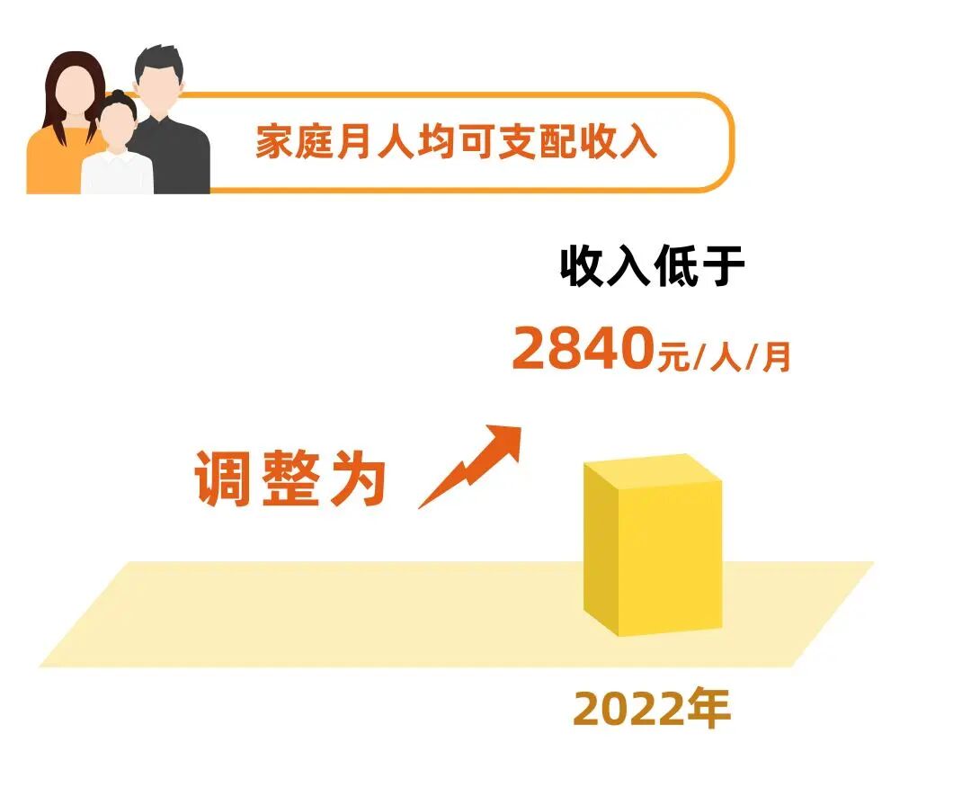 本市低收入困难家庭申请专项救助经济状况认定标准中,收入标准调整为:居民家庭月人均可支配收入低于2840元,其他标准仍按现行有关规定执行。