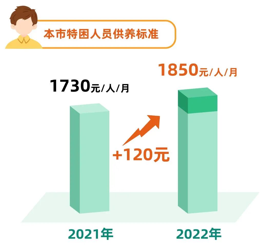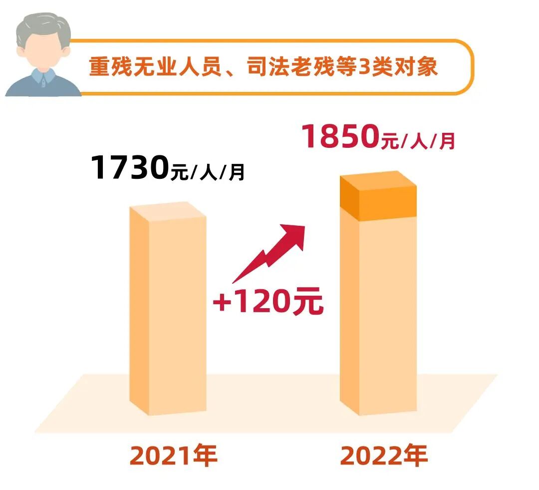 按照最低生活保障标准的1.3倍调整,从每人每月1730元调整为1850元,月增加120元。