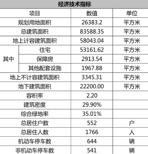 总建筑面积约为8.36万平方米,其中住宅计容面积约为5.32万平方米,保障房计容面积约为0.29万平方米,其他配套设施计容面积约为0.19万平方米,规划套数552户。