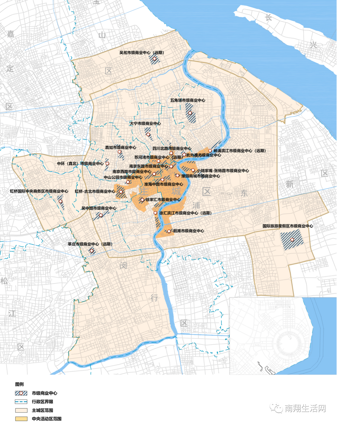 3、 市级商业中心   市级商业中心主要面向全市、长三角地区乃至全国的广域性消费人群,匹配大都市圈核心城市的功能定位,提供综合消费服务,集聚高端购物、餐饮美食、 商务休闲、文化娱乐等功能,与社会主义现代化国际大都市相适应、体现城市活 力、配套服务齐全的综合性商业功能区。 本次规划共确定 29 个市级商业中心。其中,规划近期市级商业中心 19 个, 包括南京东路商业中心、南京西路商业中心、小陆家嘴-张杨路商业中心、虹桥国 际中央商务区商业中心、北外滩商业中心、淮海中路商业中心等;   规划远期市级商业中心远期 10 个,包括徐汇滨江商业中心、杨浦滨江商业中心、苏河湾商业 中心、莘庄商业中心、吴淞商业中心、嘉定新城商业中心等。