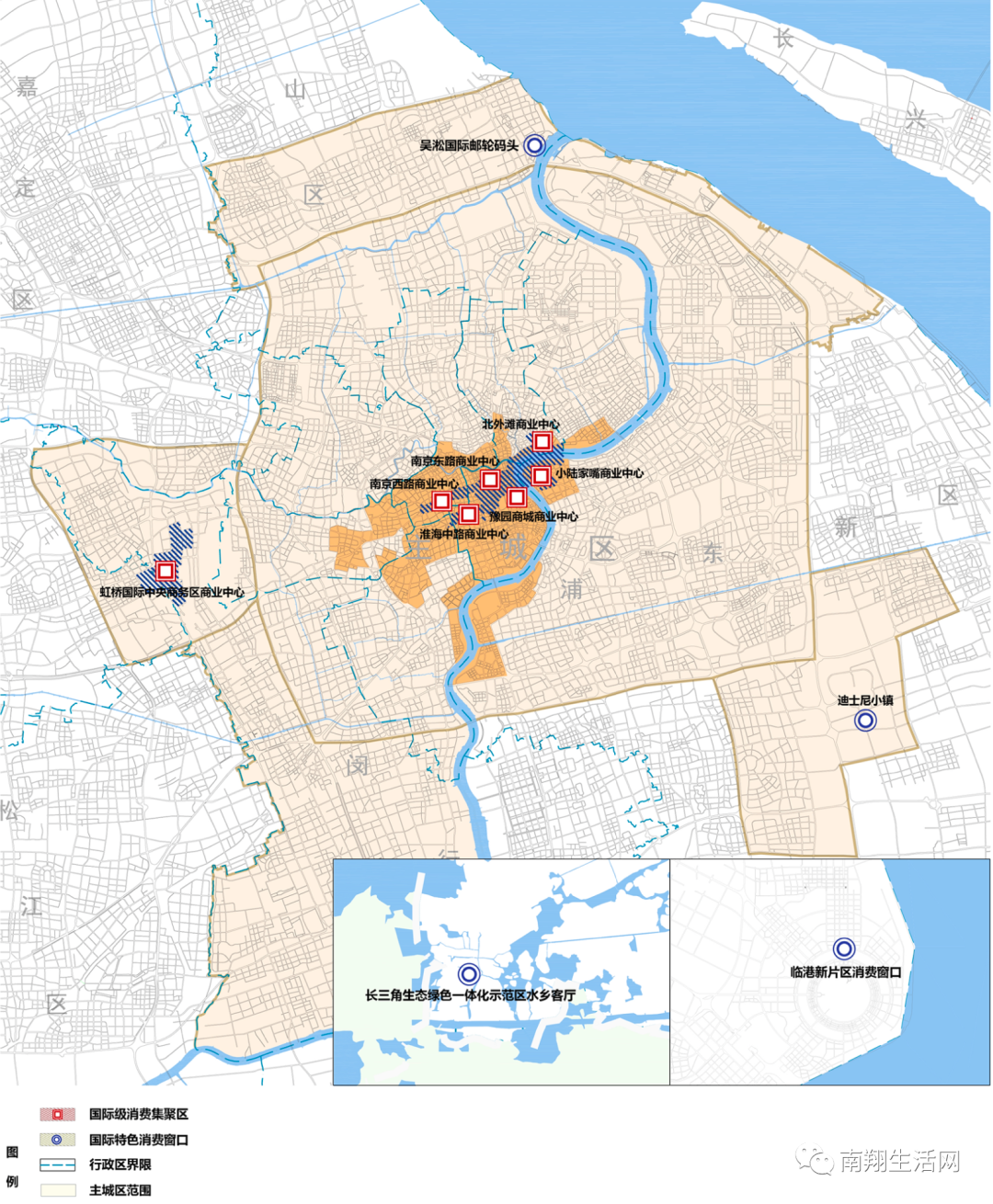 1、 商业空间体系框架   对应城市总体规划确定的城镇空间体系和公共中心体系,匹配国际消费中心城市的总体发展目标,在全市构建“4+X+2”的商业空间体系,包括由“国际级 消费集聚区、市级商业中心、地区级商业中心、社区级商业”构成的 4 级商业中 心体系,“特色商业街区、首发经济示范区、夜间经济集聚区、农产品批发市场”等构成的 X 个特色商业功能区,以及以“商贸物流体系、商业数字化体系”为主的2个配套支撑体系。   2、 国际级消费集聚区   国际级消费集聚区是上海建设国际消费中心城市的核心承载区,面向国内和国际的广域性、超广域性消费人群,放大中国国际进口博览会溢出效应,吸引国内外高端商业品牌和资源集聚,提供国际化、最顶级的综合消费服务,集高端购物、文化、旅游、金融商务、休闲娱乐、酒店会展、健康养老等功能于一体。云 集国际国内精品、引领时尚消费潮流,在商品和服务、客户、品牌商家等方面兼 具全球性和门户性特征,展示中国商业特色和消费文化,体现上海消费体验最高水平。   本次规划共划定了东、西两片国际级消费集聚区和多个国际消费窗口。 东片国际级消费集聚区以“一江一河”交汇处的“黄金三角”功能区为核心, 依托基础条件好、消费潜力大、国际化水平高的南京东路、南京西路、小陆家嘴-张杨路、淮海中路、豫园商城、北外滩等市级商业中心,联动周边文化、旅游、 体育、休闲、金融、健康养老等各类高等级消费空间共同组成。 西片国际级消费集聚区以虹桥国际开放枢纽和虹桥副中心为依托,发挥“大 交通、大商务、大会展”的区域优势,打造联系亚太、面向世界、辐射国内的重 要商贸流通中心。 国际消费窗口:划定多个具有“买全球、卖全球”国际消费特征的功能节点,例如迪士尼小镇、长三角生态绿色一体化示范区水乡客厅等。未来可以根据实际 建设发展情况予以调整。