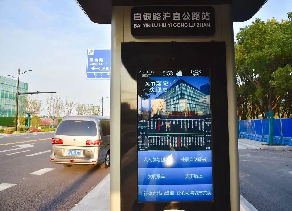 道路两侧的公交站台集合了多项功能,显示屏实时显示公交到站时间、公交车辆当前所到站点等信息。