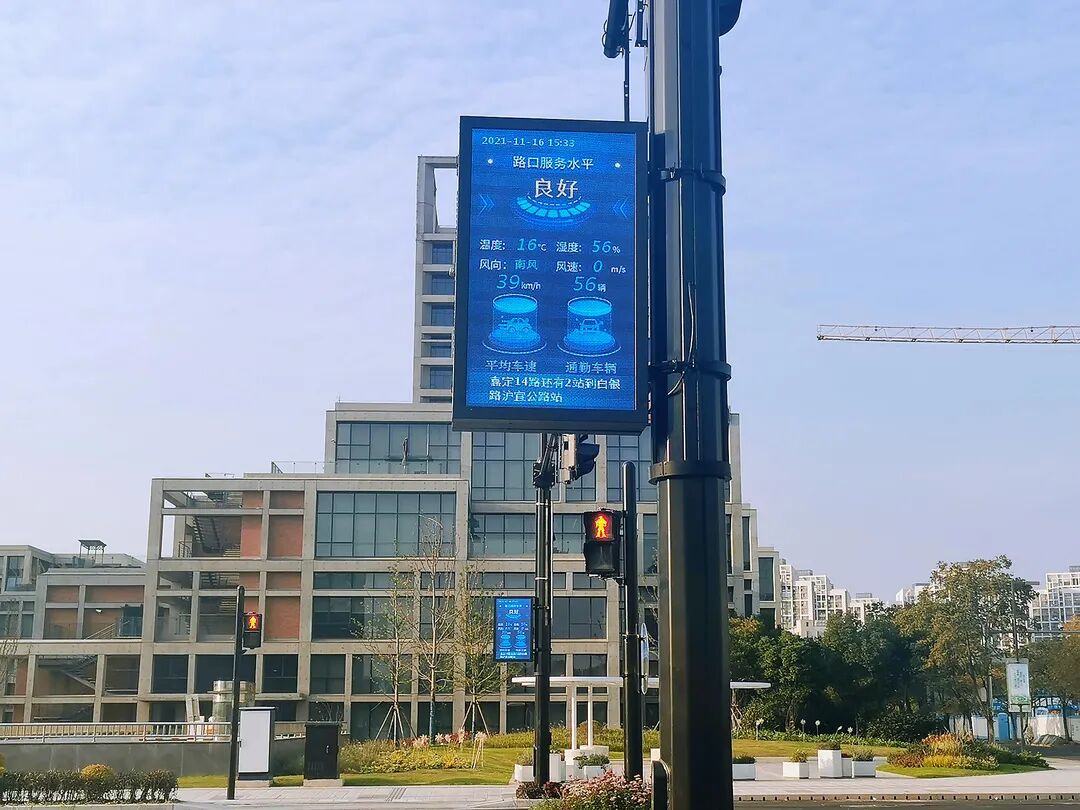 斑马线一旁的栏杆装有智能化显示屏,实时显示温度、湿度、风向、风速,以及道路车辆通行情况,公交车辆的到站情况也在屏幕上同步显示。