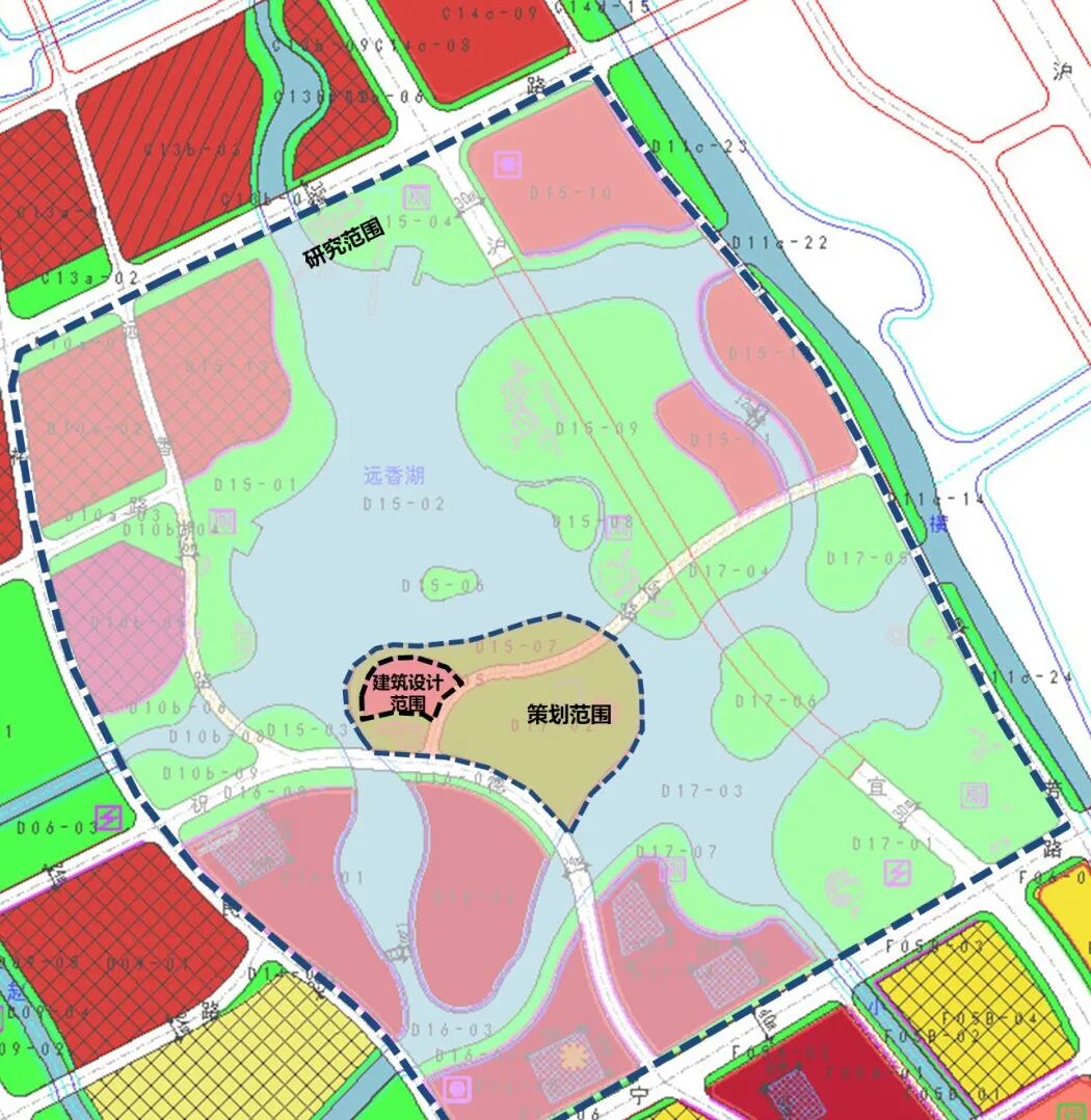 项目研究范围:远香湖公园沿湖整体片区,北至白银路,西至裕民南路,南至伊宁路,东至沪宜公路。