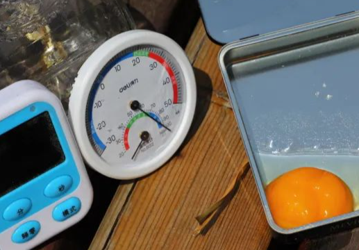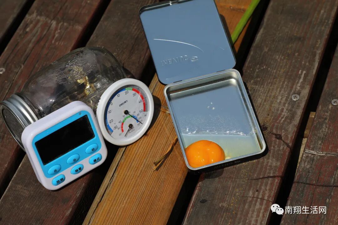 小编在嘉定为大家做了一次现场烤鸡蛋的实验。中午13点10分,实验开始。为了保证实验尽量客观,没有将实验地放在水泥地上,而是在温度反射不是特别强烈的木栈板上,小编将新鲜鸡蛋打入金属烟盒,其他交给太阳。