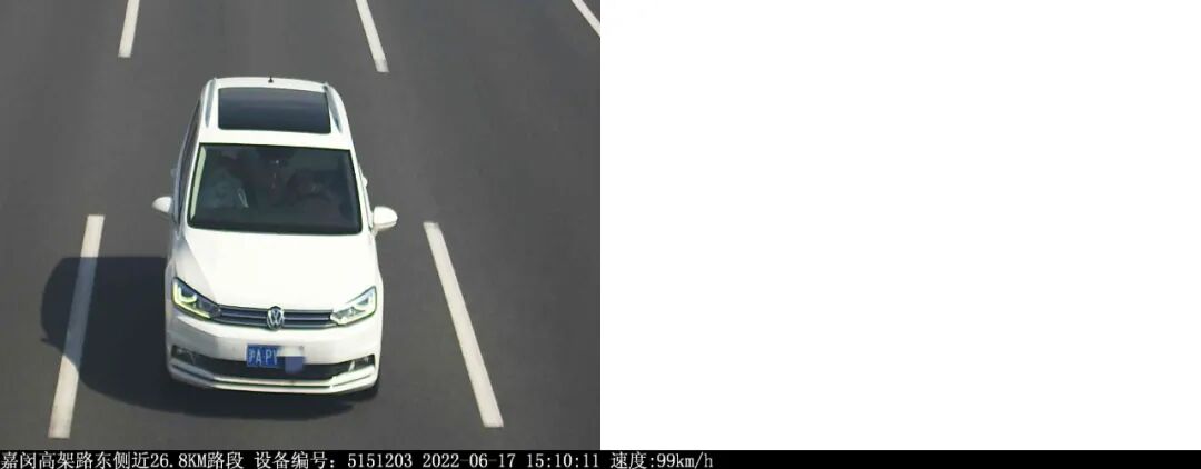 ▲2022年6月17日15时10分,号牌为沪APV***的小型普通客车在嘉闵高架路东侧近26.8KM路段,实施了“驾驶校车、中型以上载客载货汽车、危险物品运输车辆以外的机动车在城市快速路上行驶超过规定时速20%以上未达到50%的”违法行为,该车车速99km/h,限速80km/h。